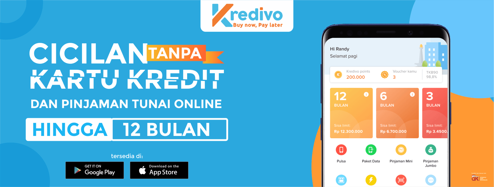 Aplikasi lain yaitu Kredivo, aplikasi ini adalah aplikasi kredit online selain AkuLaku. Mereka menyediakan limit kredit sampai jutaan rupiah dan cara penggunaan-nya pun terbilang mudah. Jadi untuk kamu yang kehabisan uang untuk membeli pulsa, bisa banget kalau menggunakan layanan PayLater di aplikasi satu ini.