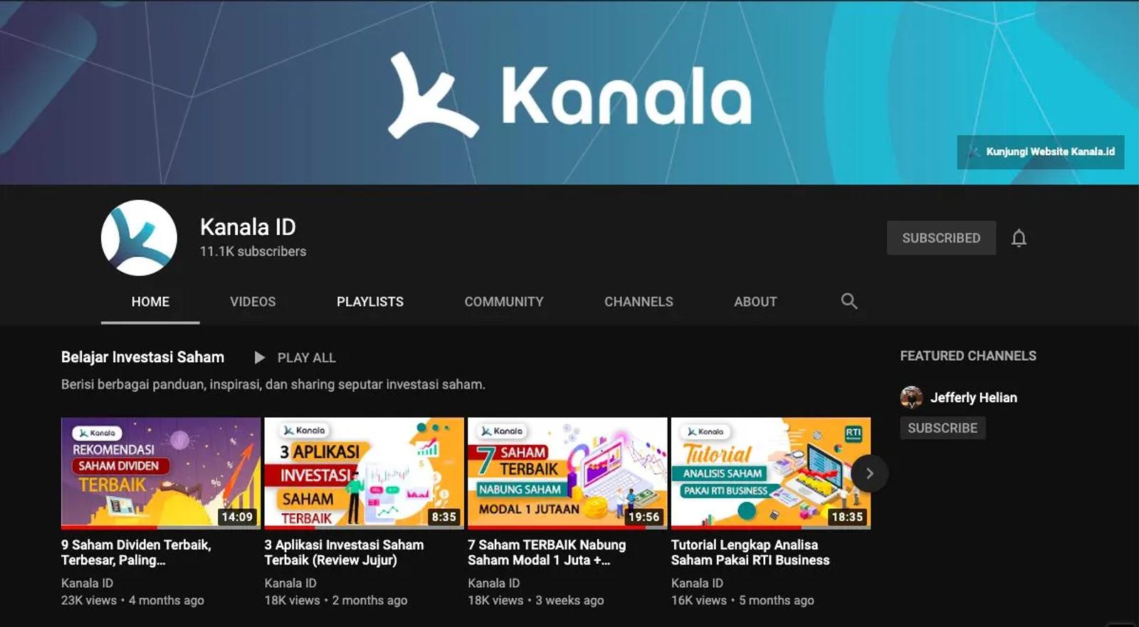 Kanala.id adalah channel YouTube yang fokus pada edukasi keuangan dan investasi, termasuk saham. Channel ini menyajikan berbagai video yang membahas topik seperti dasar-dasar investasi saham, analisis teknikal, dan tips untuk investor pemula. Dengan pendekatan yang lugas dan materi yang tersusun secara rapi, Kanala.id membantu pemula memahami dunia saham dengan lebih baik dan mempersiapkan mereka untuk menjadi investor yang cerdas.