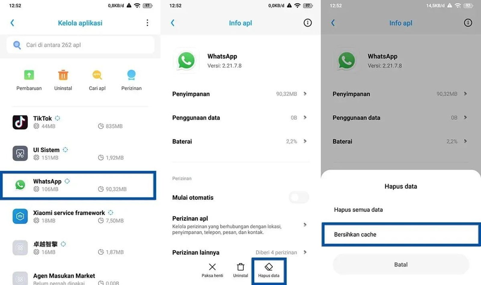 Cache sendiri berfungsi untuk menyimpan data dari berbagai aplikasi yang kamu unduh. Kamu bisa mengecek setiap aplikasi, apakah aplikasi tersebut memiliki cache yang besar. Jika iya… Kamu bisa menghapusnya. Karena itu juga menyebabkan ponsel menjadi lemot. Selain cache, kamu juga bisa menghapus data pada aplikasi tersebut. Caranya juga mudah lho, kamu hanya perlu menuju ke pengaturan. Lalu, pilih kelola aplikasi dan pilih hapus data. Terakhir, pilih bersihkan cache.