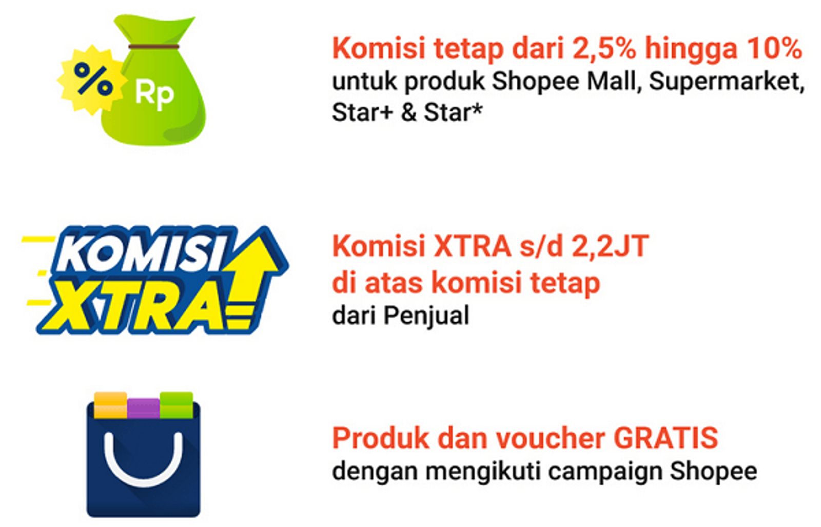 - Komisi tetap yang akan kamu dapatkan, mulai dari 2,5 persen sampai 10 persen untuk produk berikut ini: Shopee Mall, Shopee Supermarket, Star+, dan Star Seller.