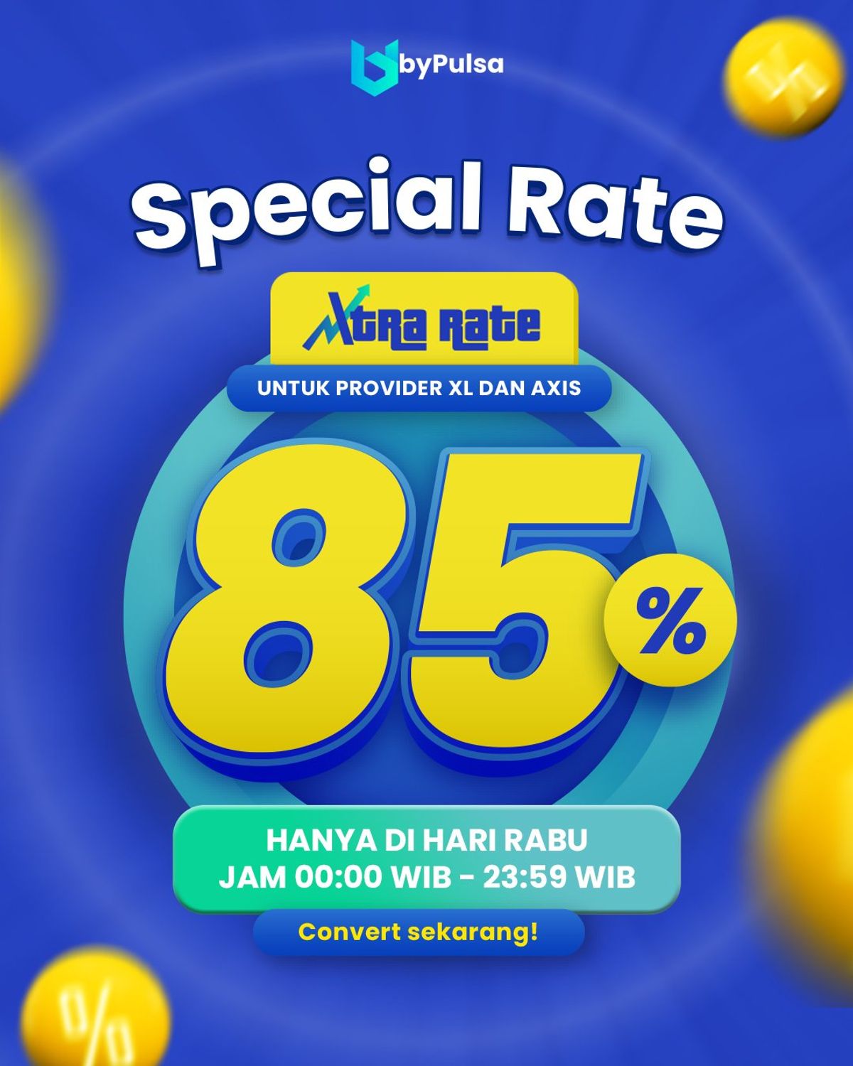 Untukmu yang memiliki provider XL/Axis. convert Rate di byPulsa dijamin makin happy dengan promo XTRA RATE tiap rabu!